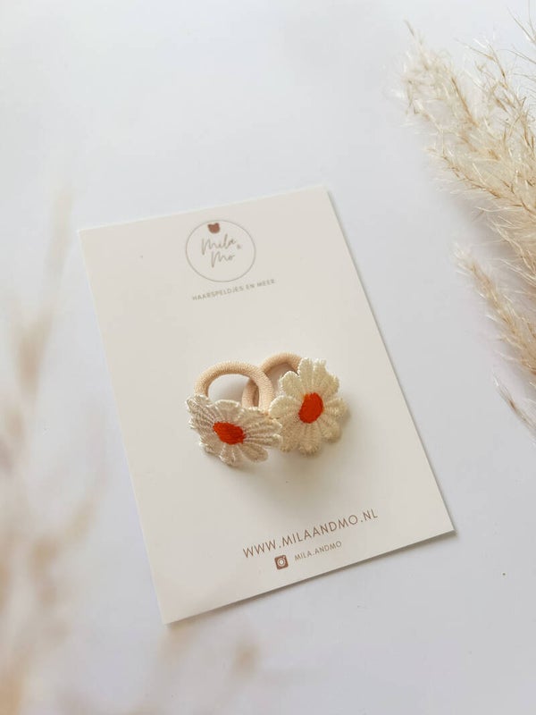 Set van 2 elastiekjes. Kies uit witte bloemetjes met oranje binnenkant of de oranje bloemetjes met witte binnenkant.