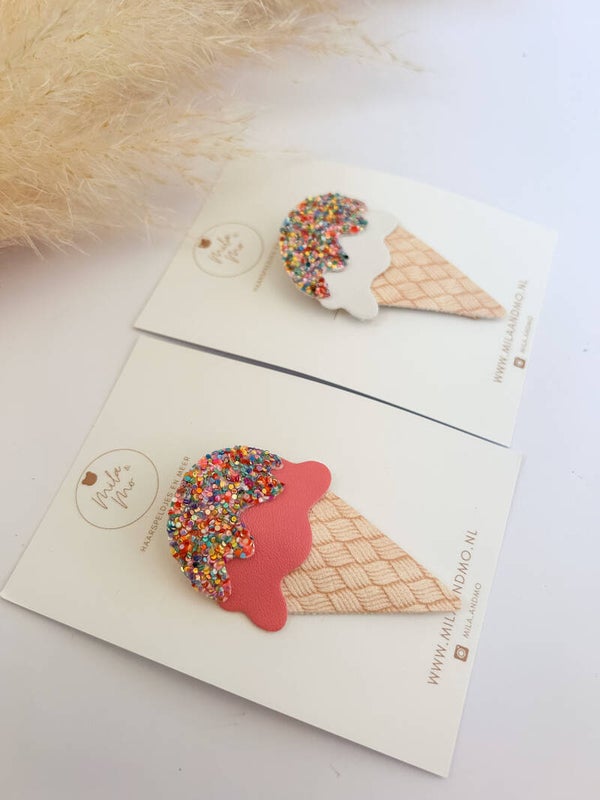 Onze vrolijke haarspeldjes zijn echte eyecatchers, speciaal voor de grote meiden met veel haar ! Dit ijsje is bevestigd op een goudkleurig 5cm alligator speldje.